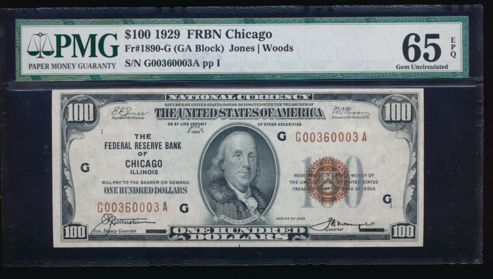 One 1929 $100 Chicago Federal Reserve Bank Note PMG 65EPQ.