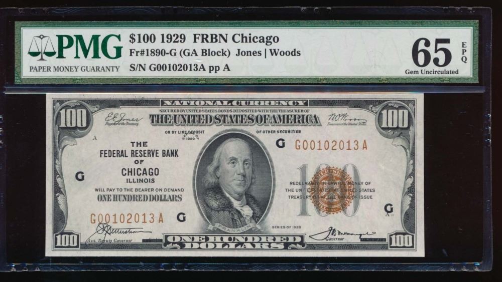 One 1929 $100 Chicago Federal Reserve Bank Note PMG 65EPQ.