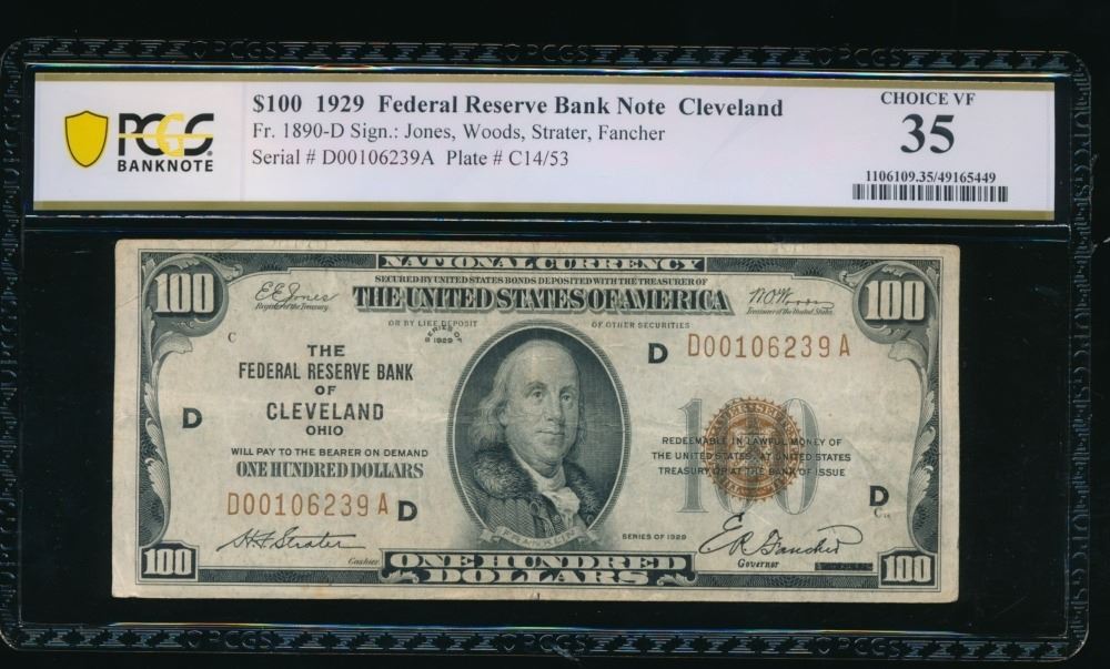 One 1929 $100 Cleveland FRBN PCGS 35.
