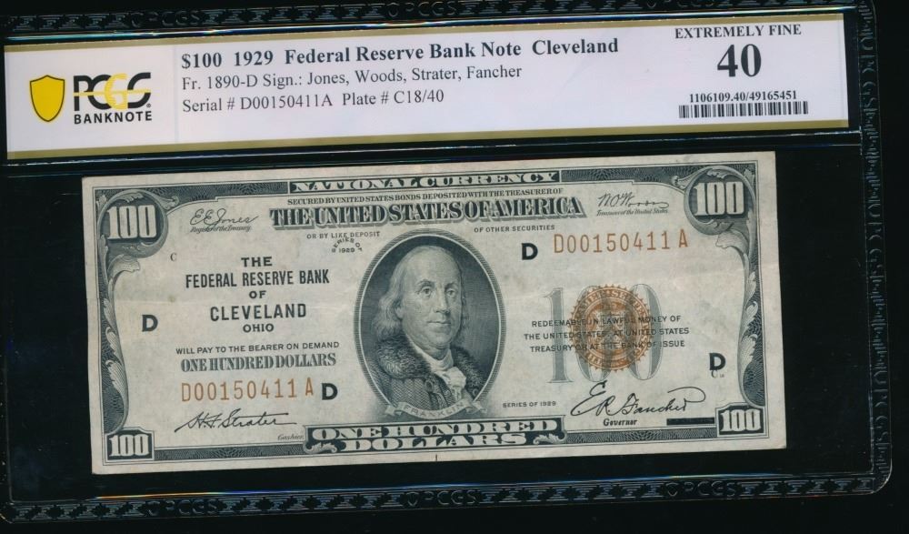 One 1929 $100 Cleveland FRBN PCGS 40.