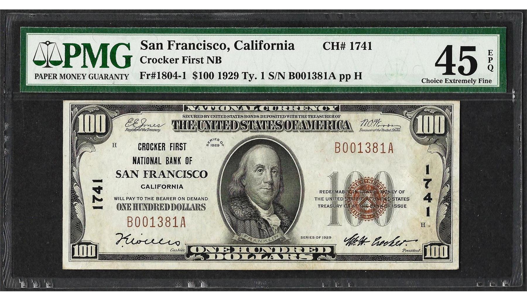 One 1929 $100 Crocker First NB San Francisco, CA CH# 1741 PMG Choice Extremely Fine 45EPQ. PMG Certified.