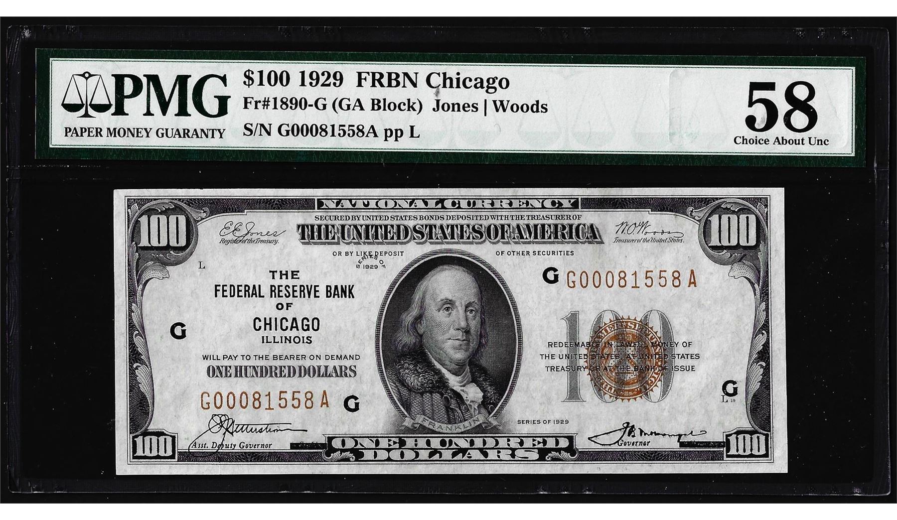 One 1929 $100 Federal Reserve Bank Note Chicago Fr.1890-G PMG Choice About Uncirculated 58. PMG Certified.