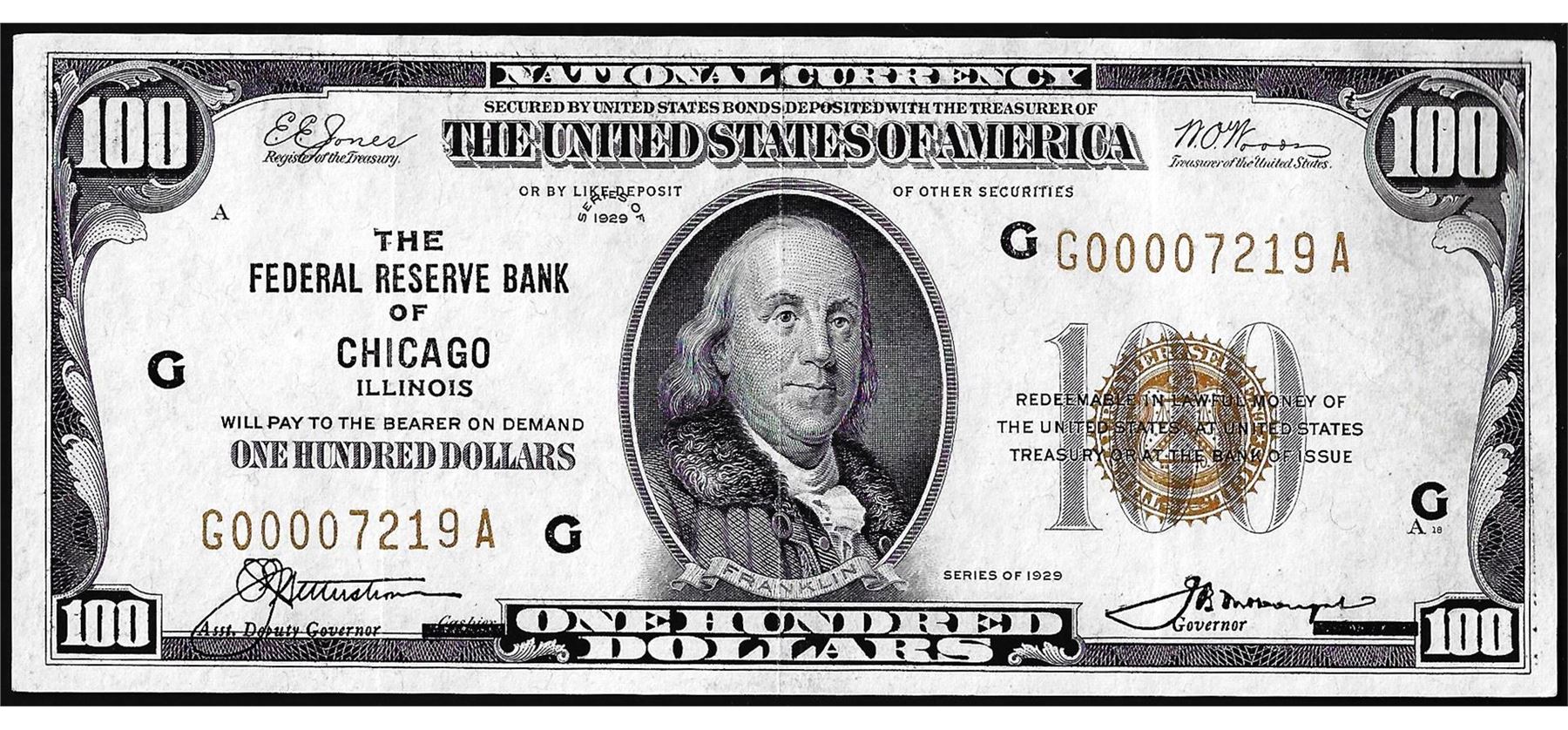One 1929 $100 Federal Reserve Bank Note Chicago.