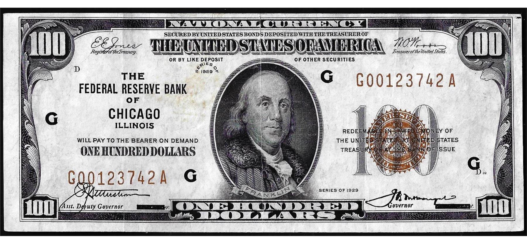 One 1929 $100 Federal Reserve Bank Note Chicago.
