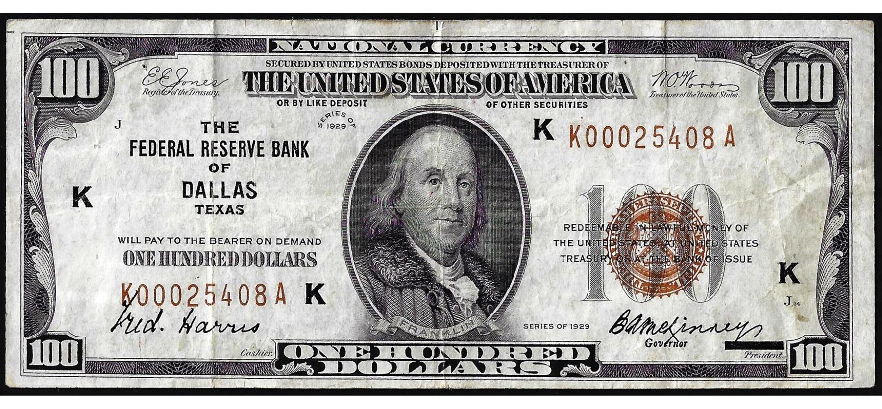 One 1929 $100 Federal Reserve Bank Note Dallas.
