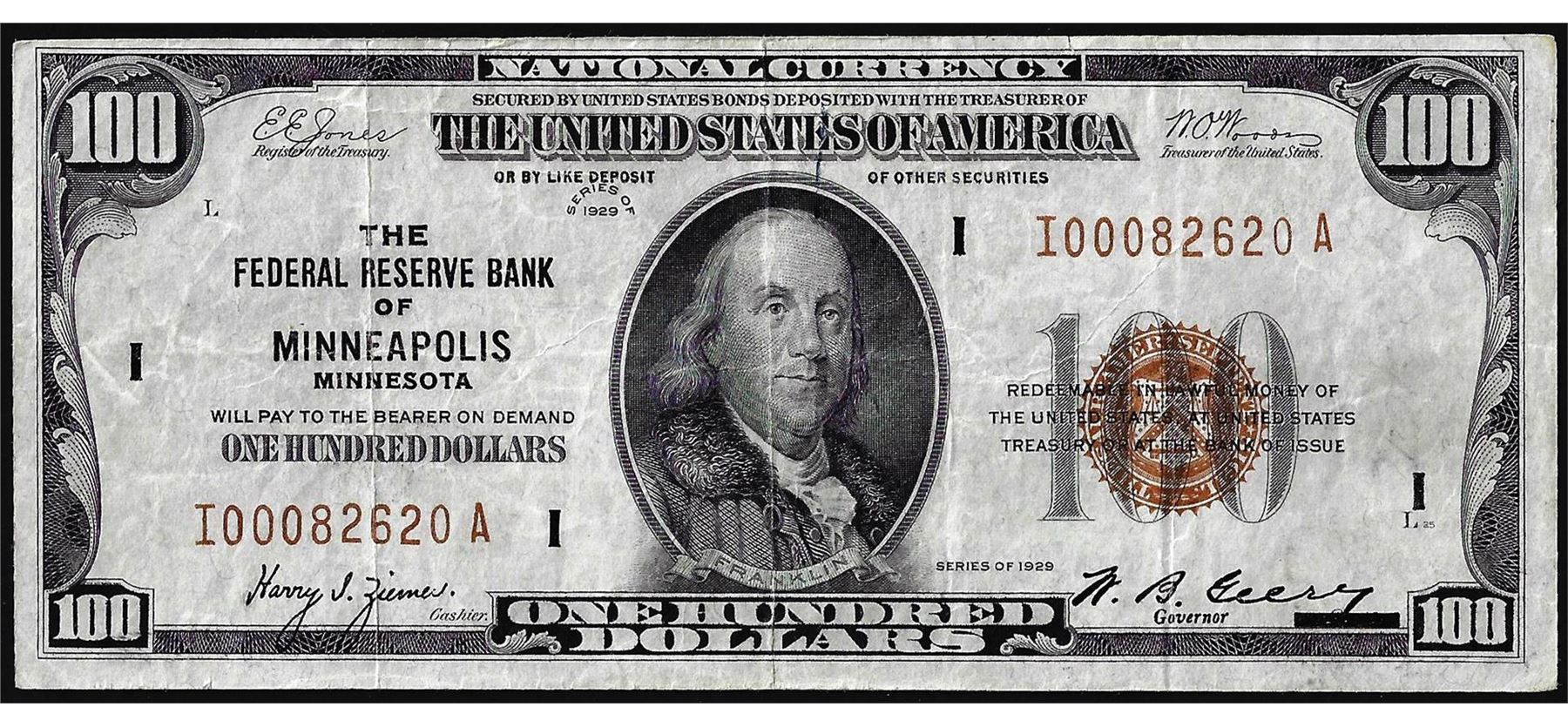 One 1929 $100 Federal Reserve Bank Note Minneapolis.