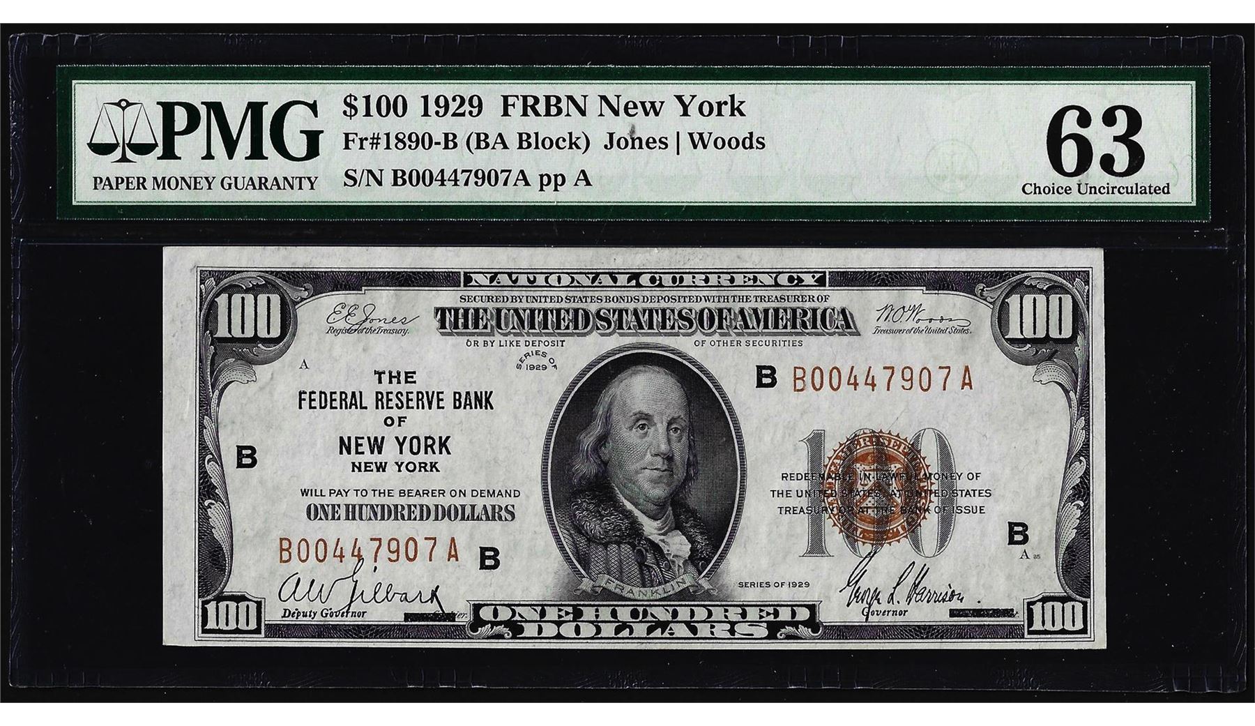 1929 $100 Federal Reserve Bank Note New York Fr.1890-B PMG Choice Uncirculated 63