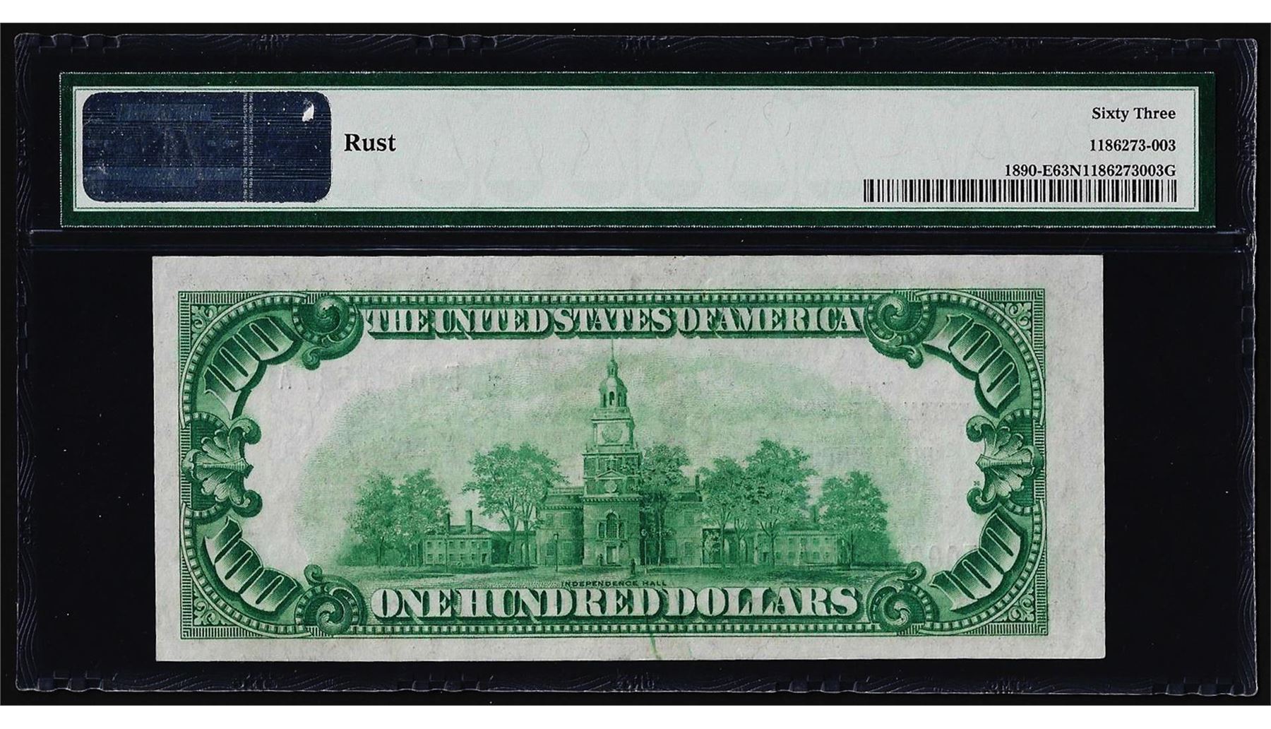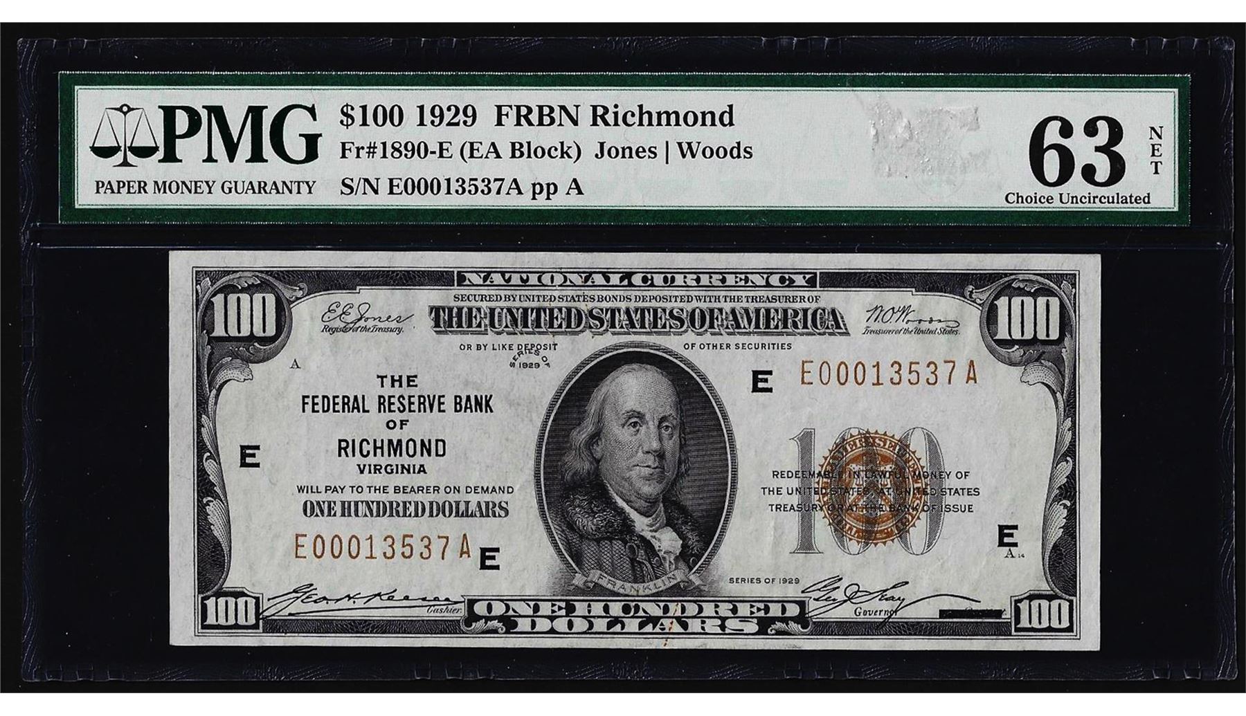 One 1929 $100 Federal Reserve Bank Note Richmond Fr.1890-E PMG Choice Uncirculated 63 Net. PMG Certified.