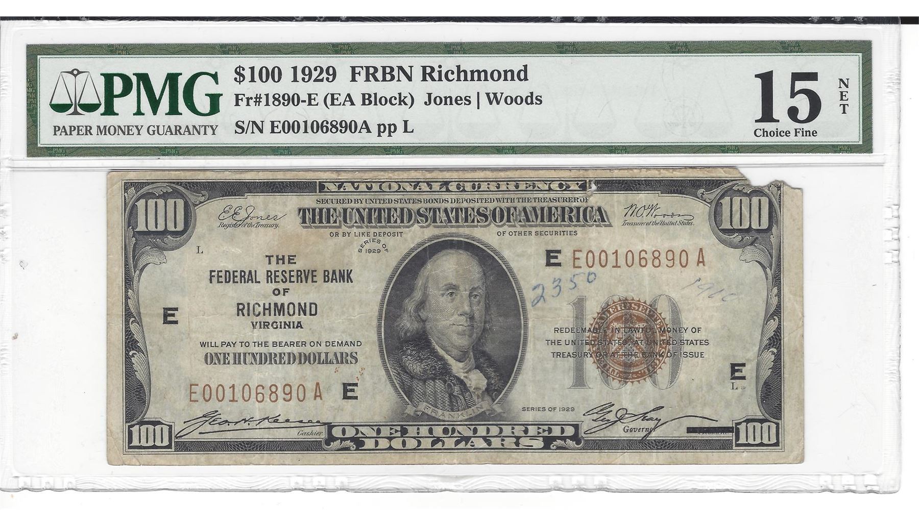 One 1929 $100 Federal Reserve Bank Note Richmond PMG Choice Fine 15 Net. PMG certified!
