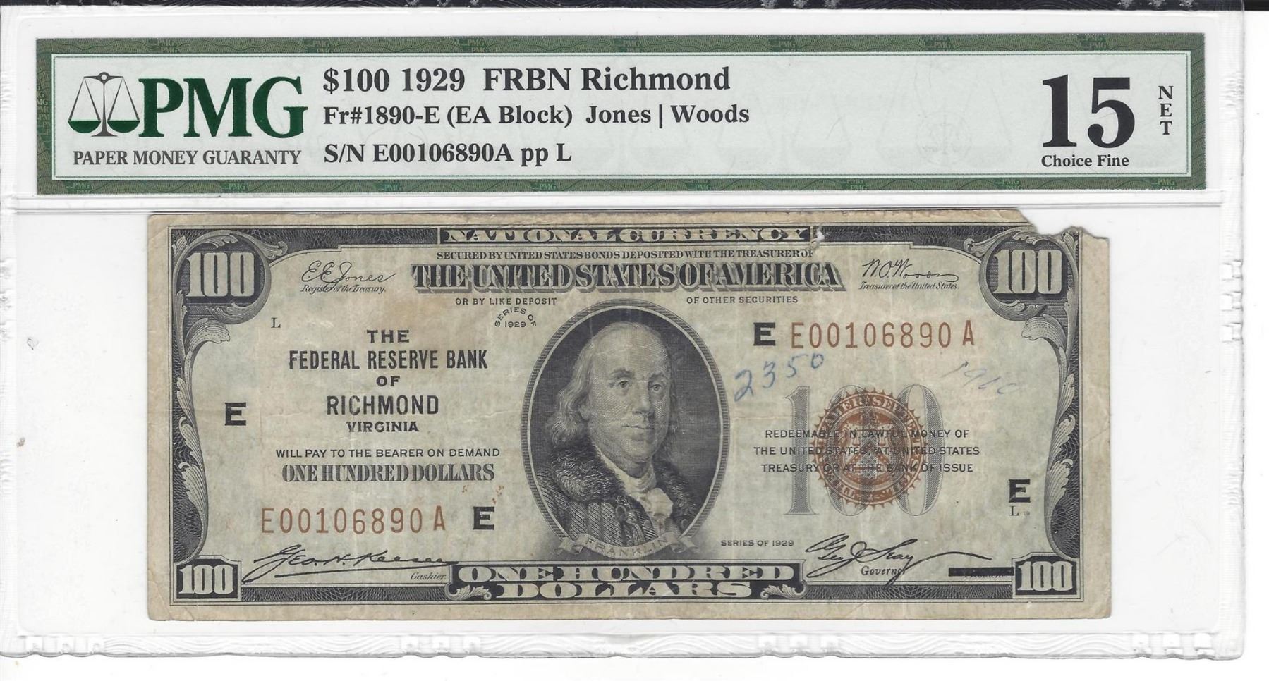 1929 $100 Federal Reserve Bank Note Richmond PMG Choice Fine 15 Net