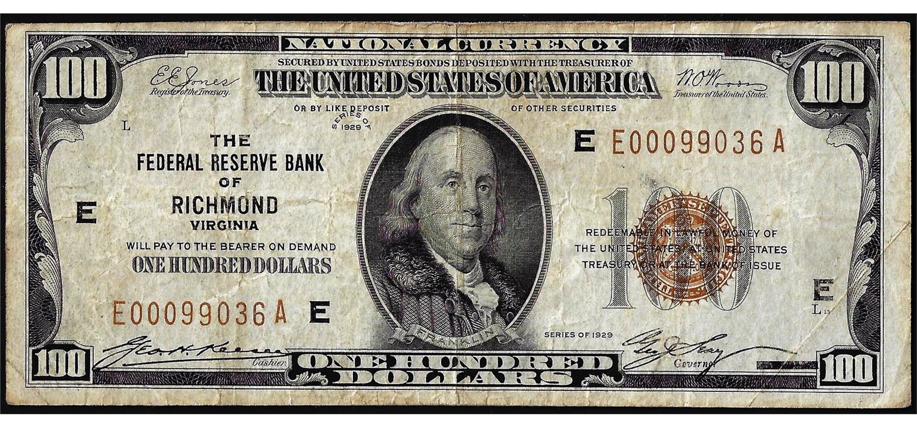 One 1929 $100 Federal Reserve Bank Note Richmond Virginia.