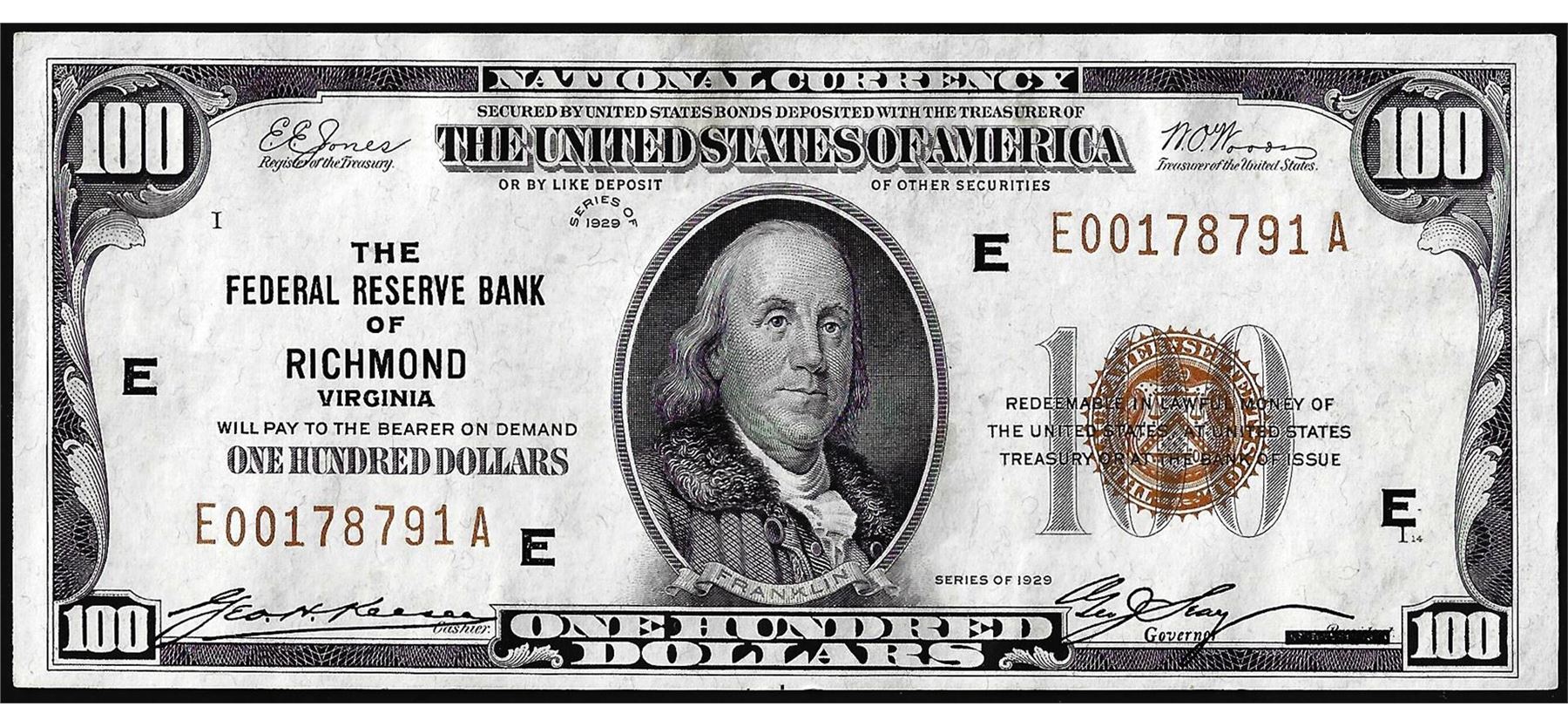 One 1929 $100 Federal Reserve Bank Note Richmond.