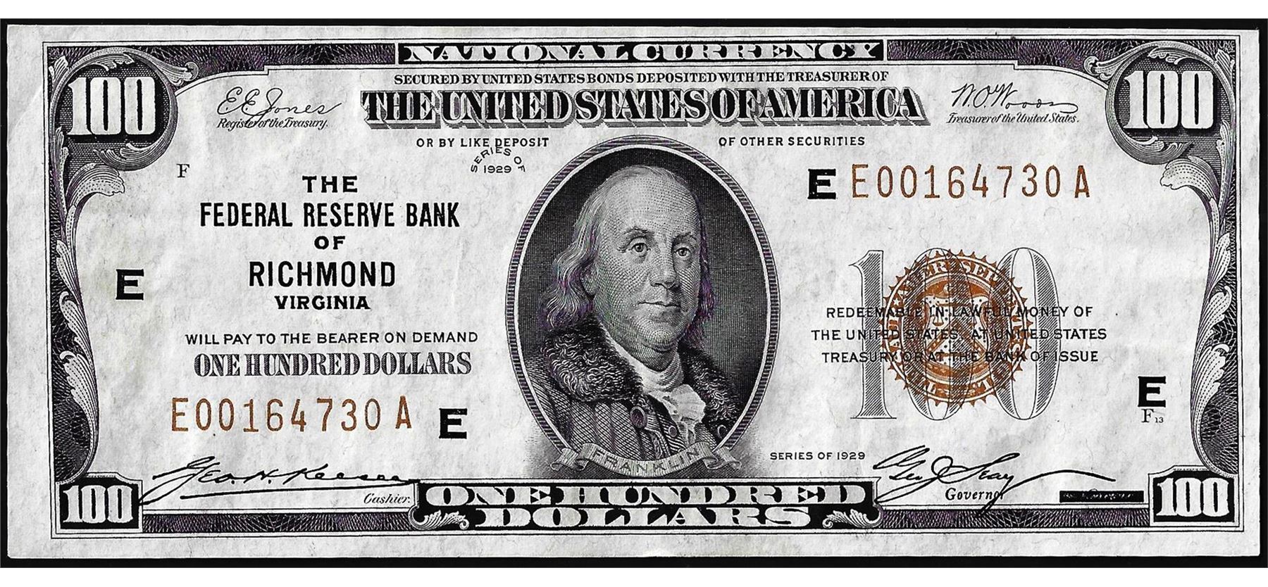 One 1929 $100 Federal Reserve Bank Note Richmond.