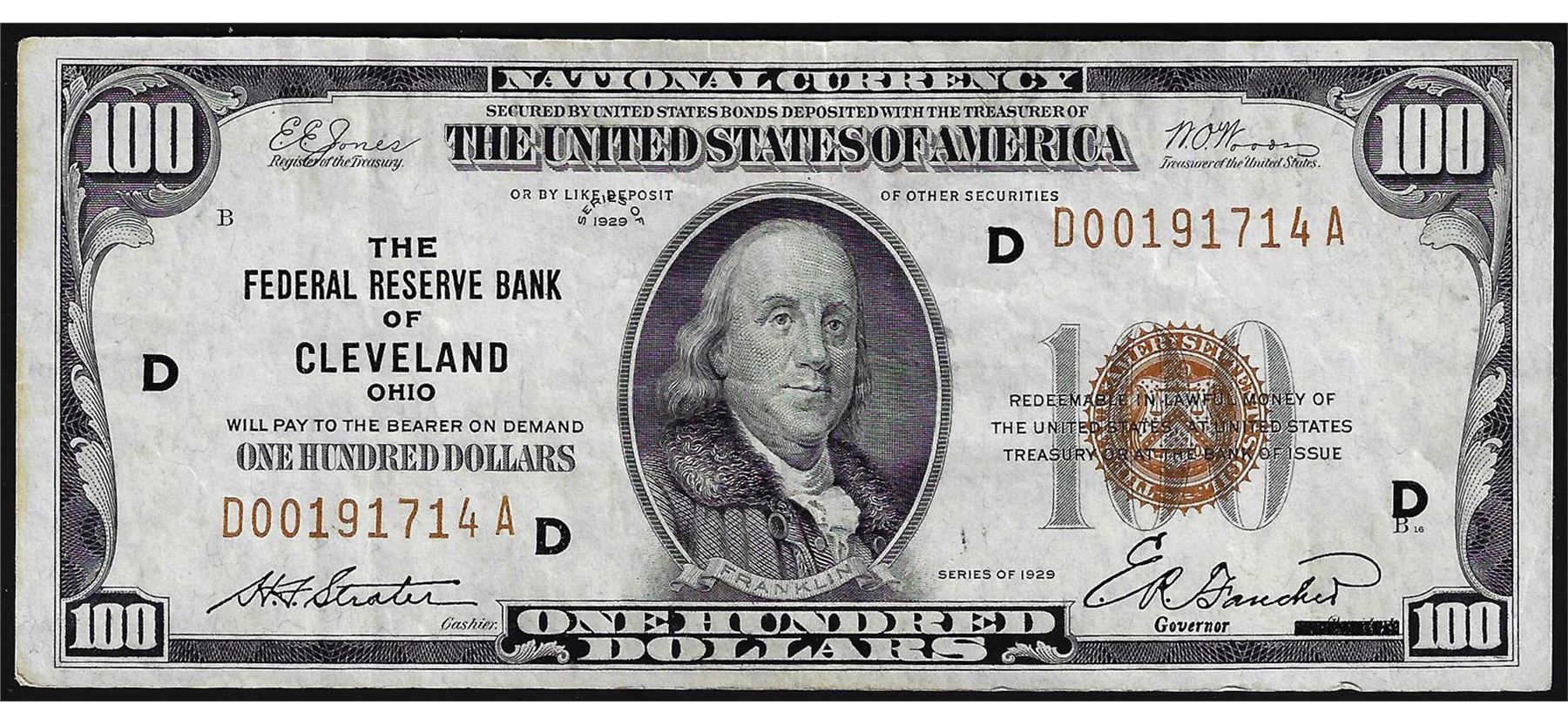One 1929 $100 Federal Reserve Bank of Cleveland National Currency Note.