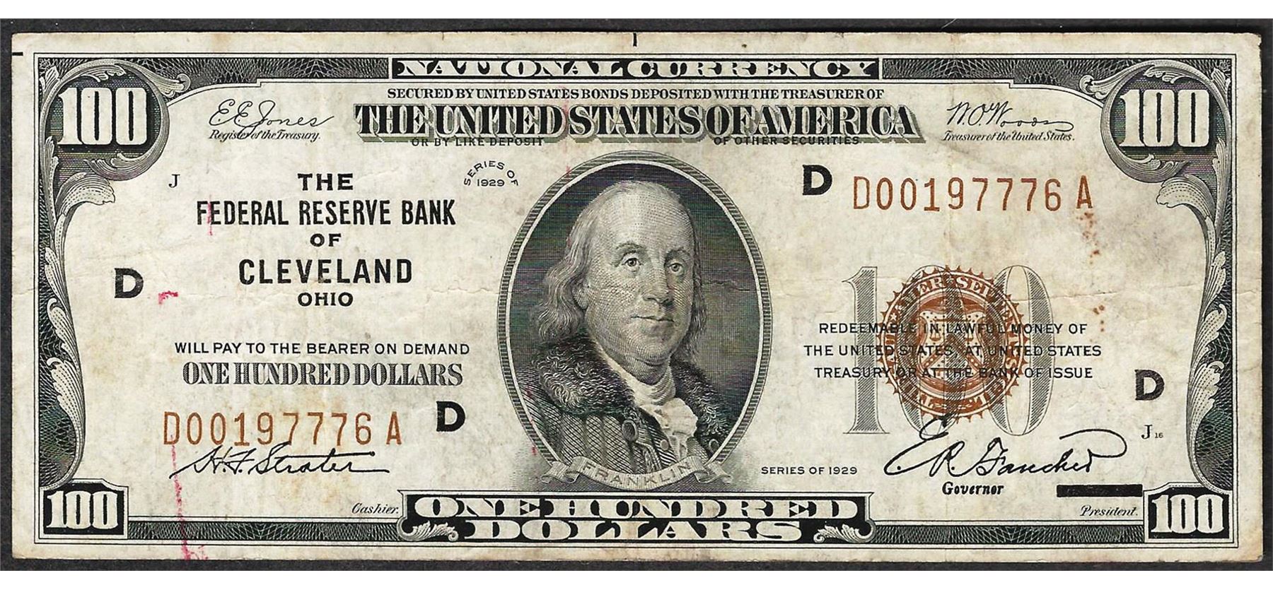 One 1929 $100 Federal Reserve Bank of Cleveland Note.