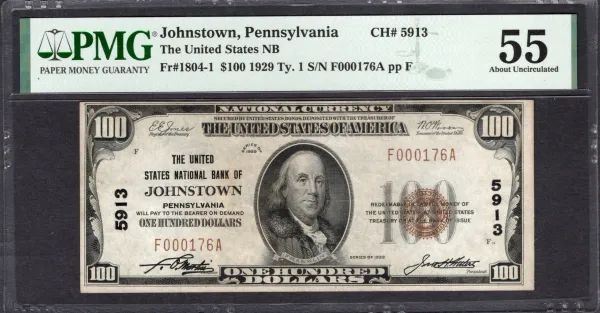 One 1929 $100 Johnstown PA National PMG 55.