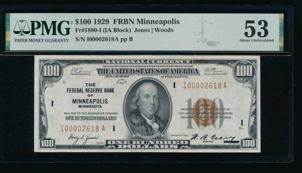 One 1929 $100 Minneapolis FRBN PMG 53.