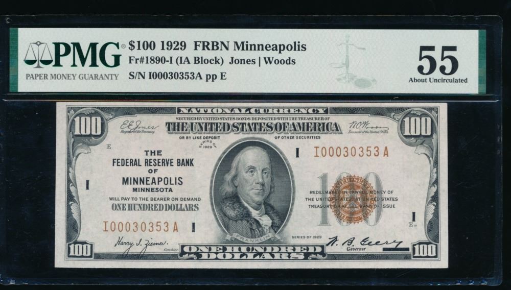 One 1929 $100 Minneapolis FRBN PMG 55.