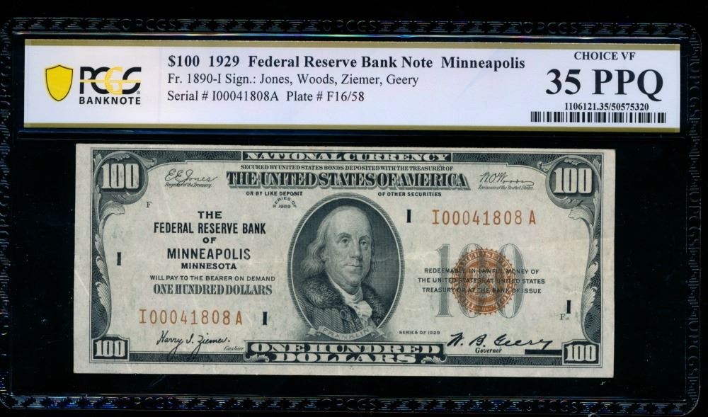One 1929 $100 Minneapolis FRN PCGS 35PPQ.