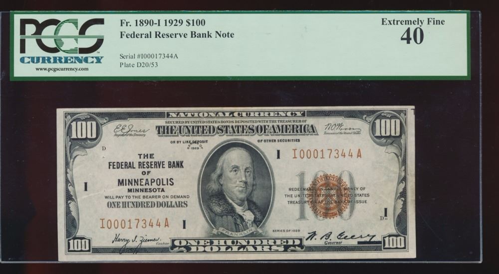 One 1929 $100 Minneapolis Federal Reserve Bank Note PCGS 40.