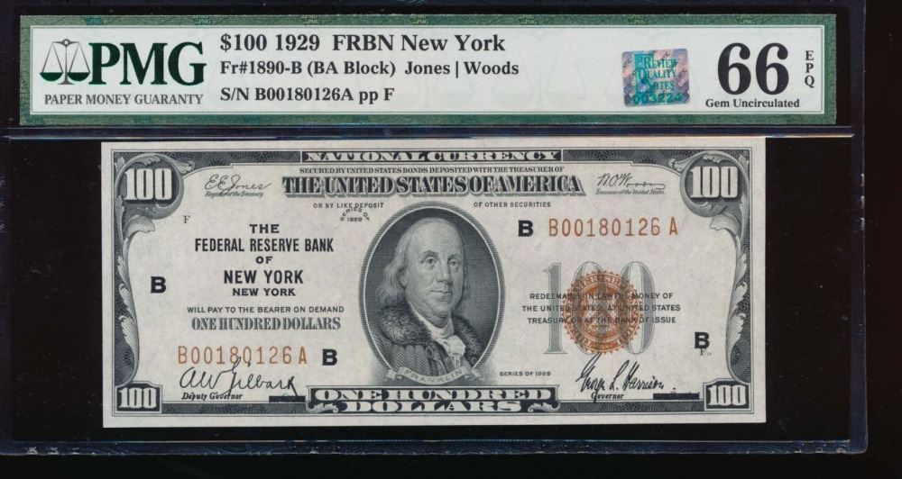 One 1929 $100 New York Federal Reserve Bank Note PMG 66EPQ.