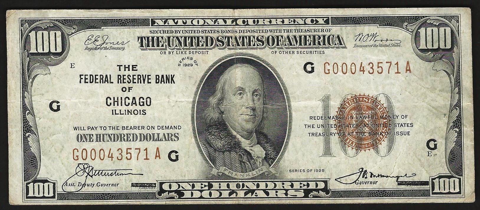 1929 $100 The Federal Reserve Bank of Chicago National Currency Note