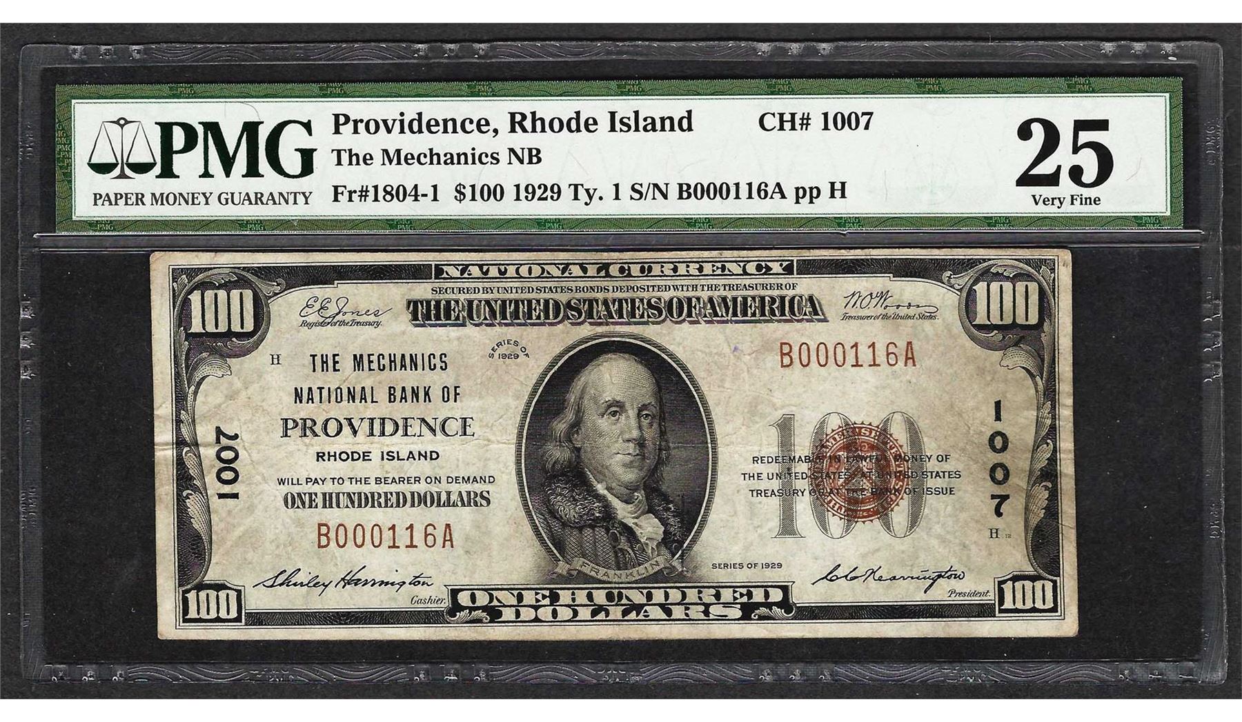 1929 $100 The Mechanics National Bank of Providence Note CH# 1007 PMG Very Fine