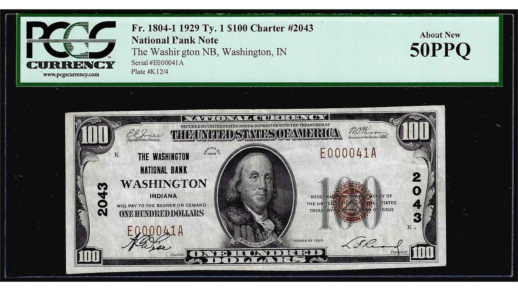 One 1929 $100 Washington, IN CH# 2043 National Note PCGS About New 50PPQ Low Serial #. PCGS Graded.