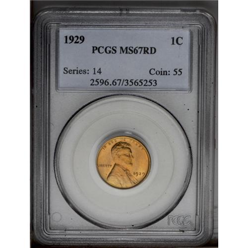 <B>1929<1C> MS67 Red PCGS.</B></I> An outstanding Superb Gem of the Lincoln cent type, with vibrant, highly lustrous surfaces which are very well struck and seemingly pristine. The rich, bright orange color is great, and there are no carbon spots to be found. Conditionally scarce with none graded finer by either of the major services. Population: 28 in 67, 0 finer (3/06).<BR><I>From The Kendall Marie #4 All-Time Finest PCGS Registry of Lincoln Cents with Varieties, Circulation Strikes, 1909-1958.</B></I> <BR><BR><B>Important notice:</B> Heritage usually auctions material at the rate of 200-250 lots per hour. On some occasions eBay Live bid software or the Internet may not be able to keep up with the pace of the auction. We recommend placing a realistic absentee bid now as insurance to avoid disappointment. Occasionally the auctioneer may eliminate or reject an eBay Live bid, and the auctioneer may also reopen a lot after the close of the eBay live bidding (usually because we missed an audience bid), and may reject your bid even if it shows you as the winning bidder. By bidding via eBay Live, you agree that Heritage may award the lot to another bidder at its sole discretion under the circumstances described above or any other reasonable circumstances. Since eBay bids are not shown to us until we open the lot on the floor, we treat those bids just like floor bids. In most cases the floor responds before the eBay bid is presented to us, due to Internet lag time, so for consistency we have made it a policy that floor bids are always considered first over tie eBay live bids. Also please note that all Heritage lots purchased through eBay Live carry a 20% Buyer's Premium. Please make sure you read the Terms and Conditions before you bid. This lot is being auctioned in conjunction with a live floor auction by Heritage Galleries & Auctioneers. All final auction and invoice information will be supplied by Heritage Galleries & Auctioneers, and all other information should be considered preliminary. Lot:524 <BR><BR><B>Winning Notification and Billing:</B> After the FINAL session in this auction is complete, Heritage will send e-mail and snail mail invoices. This process normally takes several days. All final auction and invoice information will be supplied by Heritage Galleries & Auctioneers, and all other information should be considered preliminary. <BR><BR>This auction will be conducted on a live auction floor and over the Internet through eBay Live. If you choose to place an absentee bid, please take a moment to <font color='#0000ff'><u><a href='http://pages.ebay.com/liveauctions/help/before/laabsentee.html'>learn how eBay Live absentee bidding works</a></u></font><font color='#000000'>