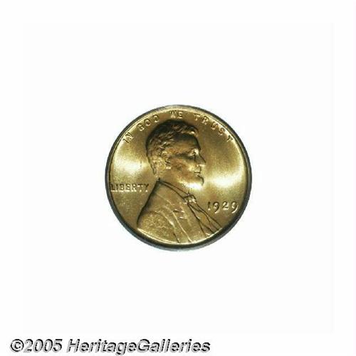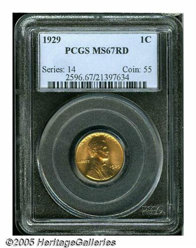 <B>1929<1C> MS67 Red PCGS.</B></I> Splendidly original luster shimmers across both sides in orange-red coloring. There is a lovely bright satiny sheen throughout, and the surfaces are free of even the most trivial blemish. Conditionally scarce, despite a sizeable original mintage. Population: 26 in 67 Red, 0 finer (6/05).<BR><I>From The William Bickel Collection, Part One.</B></I>