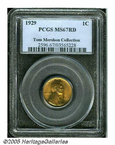 <B>1929<1C> MS67 Red PCGS.</B></I> This brilliant red Cent is tied for finest certified by PCGS, an important consideration for the Set Registry collector. This cent has rich honey-gold luster with frosty surfaces and Superb eye appeal. An exceptional price for this date is expected. Population: 24 in 67, 0 finer (3/05).<BR><I>From The Tom Mershon #2 All-Time PCGS Registry Set of Lincoln Wheat Cents.</B></I>