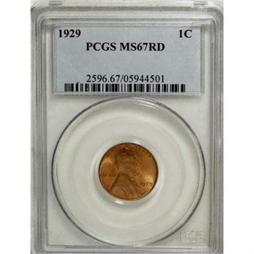 <B>1929 1C MS67 Red PCGS.</B></I> Both sides of this Superb Gem are awash with vibrant luster and stunning copper-orange color, and a well executed strike imparts excellent definition to the design features, including the bow tie and the grains and lines on the wheat stalks. Impeccably preserved throughout. Population: 31 in 67 Red, 0 finer (8/07).<BR><BR><B>Coin Engraver:</B> Victor D. Brenner<BR><BR><b>Shipping:</b> Coins & Currency (<a target="_blank" href="http://www.heritageauctions.com/common/shipping.php">view shipping information</a>)