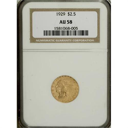 <B>1929 $2 1/2 AU58 NGC.</B></I> NGC Census: (269/12786). PCGS Population (609/9019). Mintage: 532,000. Numismedia Wsl. Price for NGC/PCGS coin in AU58: $231. (#7953)<BR><BR><B>Coin Engraver:</B> Bela Lyon Pratt<BR><BR><b>Shipping:</b> Coins & Currency (<a target="_blank" href="http://www.heritageauctions.com/common/shipping.php">view shipping information</a>)