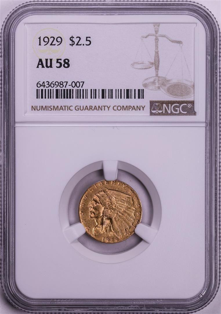 One 1929 $2 1/2 Indian Head Quarter Eagle Gold Coin NGC AU58. NGC Certified.