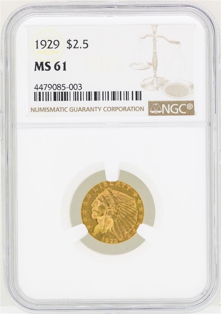 One 1929 $2 1/2 Indian Head Quarter Eagle Gold Coin NGC MS61. NGC Certified.