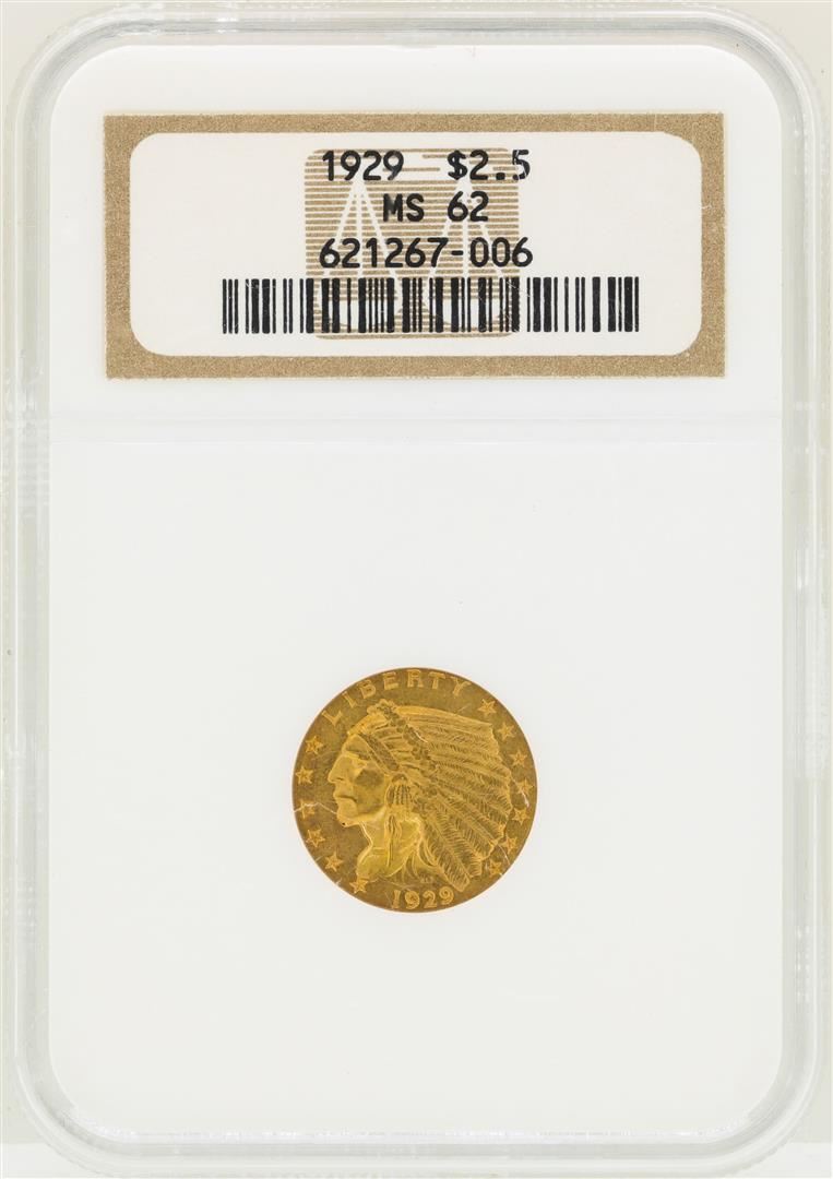 One 1929 $2 1/2 Indian Head Quarter Eagle Gold Coin NGC MS62. NGC Certified.
