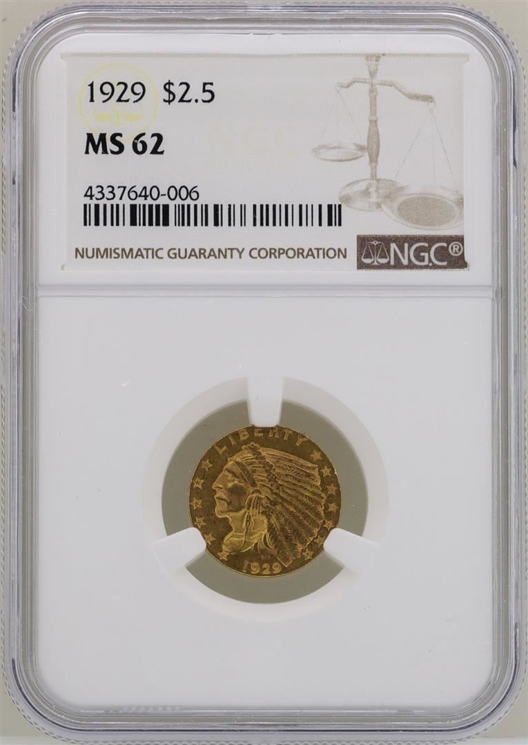 One 1929 $2 1/2 Indian Head Quarter Eagle Gold Coin NGC MS62. NGC Certified.