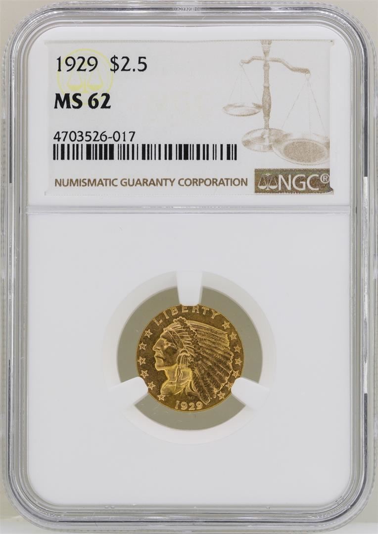 One 1929 $2 1/2 Indian Head Quarter Eagle Gold Coin NGC MS62. NGC Certified.
