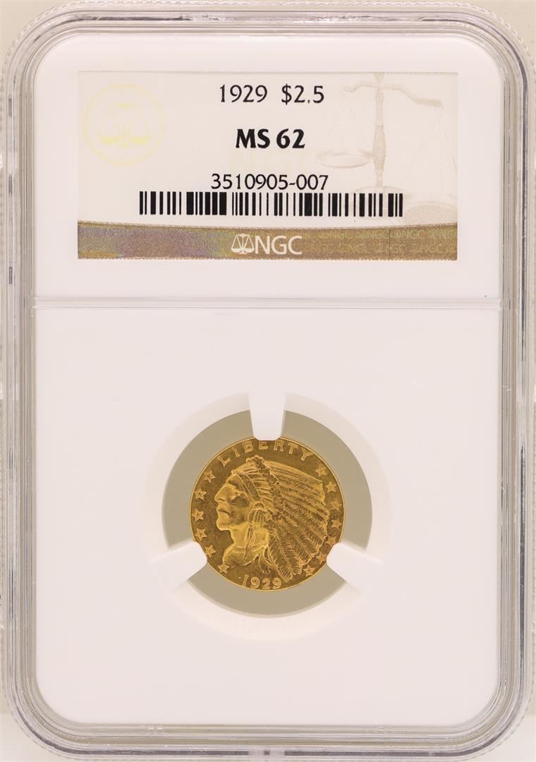 One 1929 $2 1/2 Indian Head Quarter Eagle Gold Coin NGC MS62. NGC Certified.