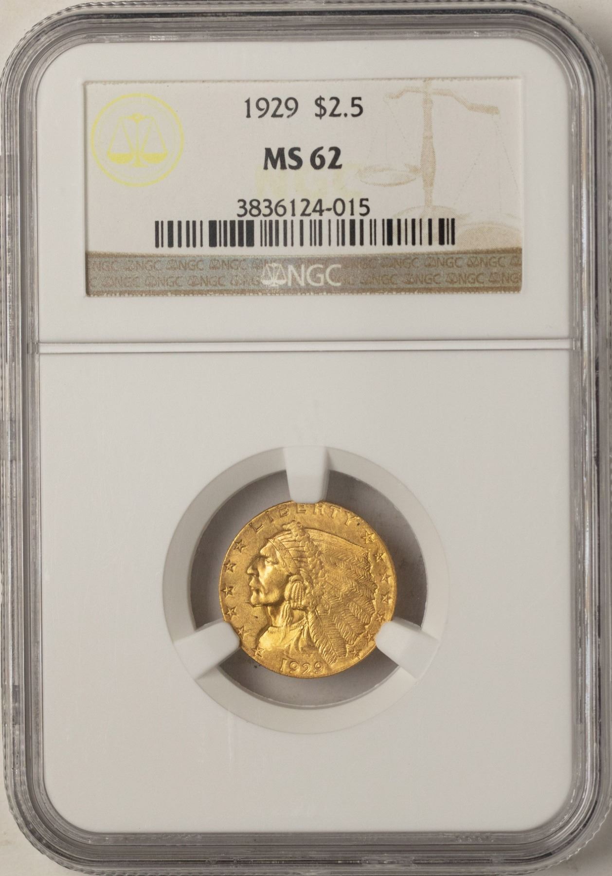 One 1929 $2 1/2 Indian Head Quarter Eagle Gold Coin NGC MS62.