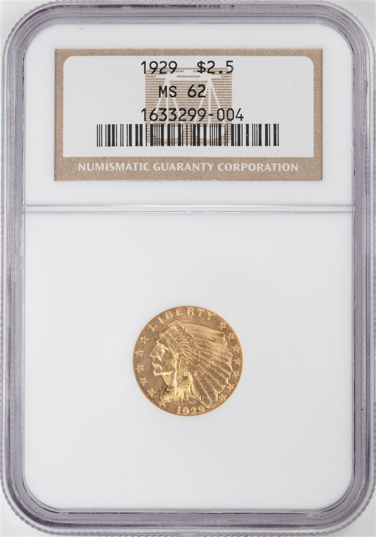 One 1929 $2 1/2 Indian Head Quarter Eagle Gold Coin NGC MS62. NGC Certified.
