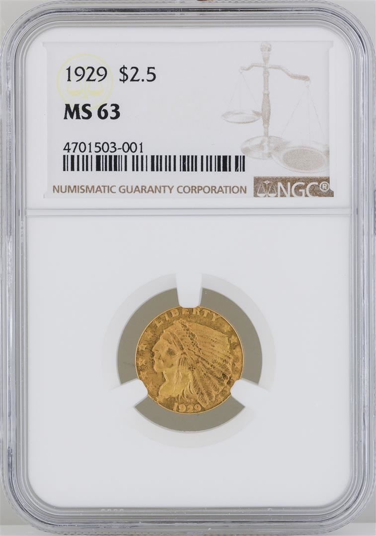 One 1929 $2 1/2 Indian Head Quarter Eagle Gold Coin. NGC certified. NGC Certified.
