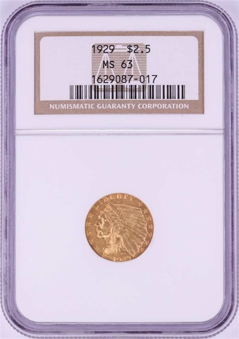 One 1929 $2 1/2 Indian Head Quarter Eagle Gold Coin NGC MS63. NGC Certified.