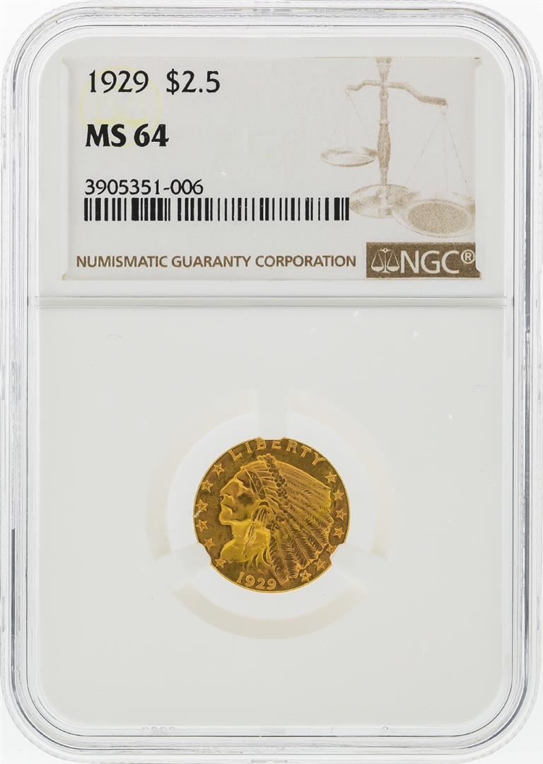 One 1929 $2 1/2 Indian Head Quarter Eagle Gold Coin NGC MS64. NGC Certified.
