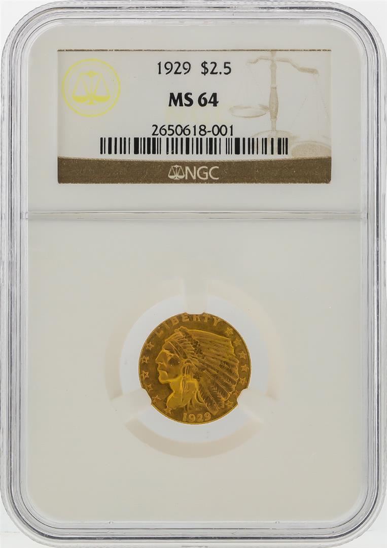 One 1929 $2 1/2 Indian Head Quarter Eagle Gold Coin NGC MS64. NGC Certified.