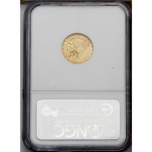 <B>1929<$2 1/2> Indian Quarter Eagle--Reverse Struck Through--MS63 NGC.</B></I> A shallow, broad strike-through affects UNITED. This shimmering and lightly abraded example is reasonably struck, and has a hint of olive toning on the cheekbone.