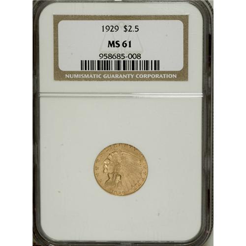 <B>1929 $2 1/2 MS61 NGC.</B></I> NGC Census: (1569/10534). PCGS Population (1426/7003). Mintage: 532,000. Numismedia Wsl. Price: $340. (#7953)<BR><BR><b>Shipping:</b> Coins & Currency (<a target="_blank" href="http://www.heritageauctions.com/common/shipping.php">view shipping information</a>)
