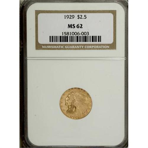 <B>1929 $2 1/2 MS62 NGC.</B></I> NGC Census: (5132/5812). PCGS Population (3187/3964). Mintage: 532,000. Numismedia Wsl. Price for NGC/PCGS coin in MS62: $485. (#7953)<BR><BR><B>Coin Engraver:</B> Bela Lyon Pratt<BR><BR><b>Shipping:</b> Coins & Currency (<a target="_blank" href="http://www.heritageauctions.com/common/shipping.php">view shipping information</a>)