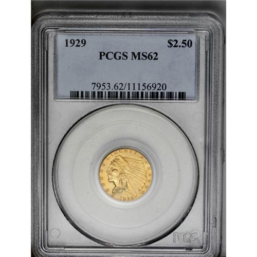 <B>1929<$2 1/2> MS62 PCGS.</B></I> Unusual and unusually attractive, the surfaces are a deep, rich tangerine-gold, with glimpses of hazel-gray in the recesses and radiant luster throughout. A number of scattered abrasions and pinscratches account for the grade.<BR><I>From The Jackson Hole Collection.</B></I>