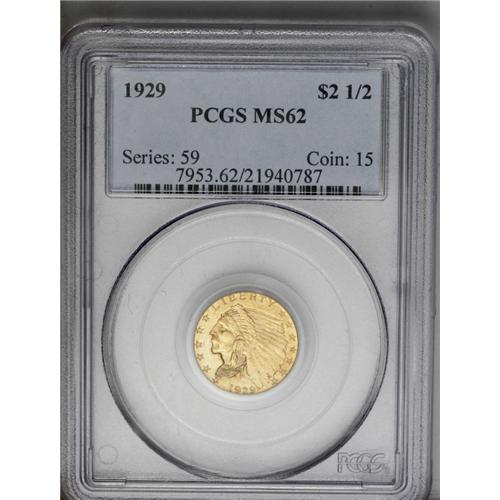 <B>1929<$2 1/2> MS62 PCGS.</B></I> Mint-green and apricot toning occur in a variegated fashion over both sides. The luster is slightly weak, but the surfaces are free of severe abrasions.